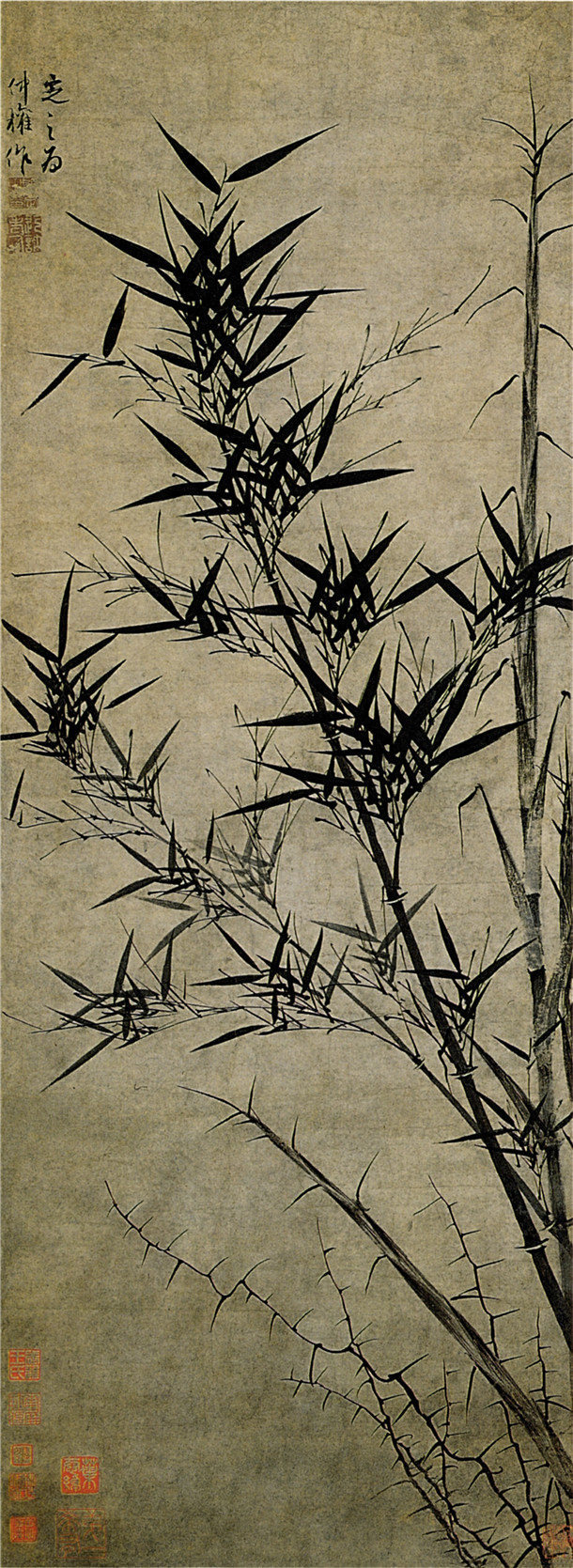 简介: 作品内容多描写风竹的新篁。运笔遒劲,法度严谨,墨色浓润而匀净,表现风竹的偃仰扶疏、或是新篁的挺健嫩秀,结构取势都恰到好处,具有生动之致,行笔谨严,遒劲挺秀,用墨润泽焕烂,画湖石带勾带染,得皱透之姿,在李衍、柯九思外,自有一股萧疏清逸之气,成为一格。