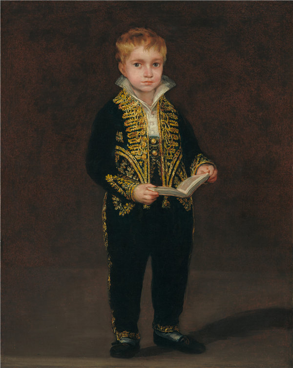 男孩手里小心翼翼地拿着一本书,象征着一定程度的教育或对学习的兴趣,这增加了该主题的特征。他的面部表情传达出一种庄严和内省的感觉——这是戈雅在肖像画中经常捕捉到的显着特征,暗示了拍摄对象的内心生活。艺术作品中光线的运用很微妙,男孩的脸上和衣服上有柔和的照明,增强了夹克上精致的细节工作和年轻人的认真表情。柔和的调色板和缺乏详细的环境将观众的注意力集中在心理描绘上,这是戈雅肖像画的标志,颂扬了人类精神的深度和复杂性。