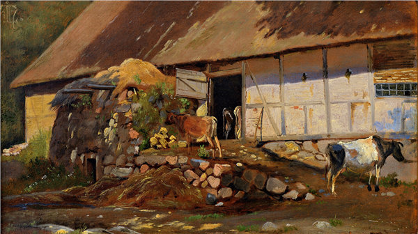 简介: 约翰·托马斯·伦德拜 (Johan Thomas Lundbye,1818-1848)-牛棚外的伦德拜,1847 年 丹麦油画