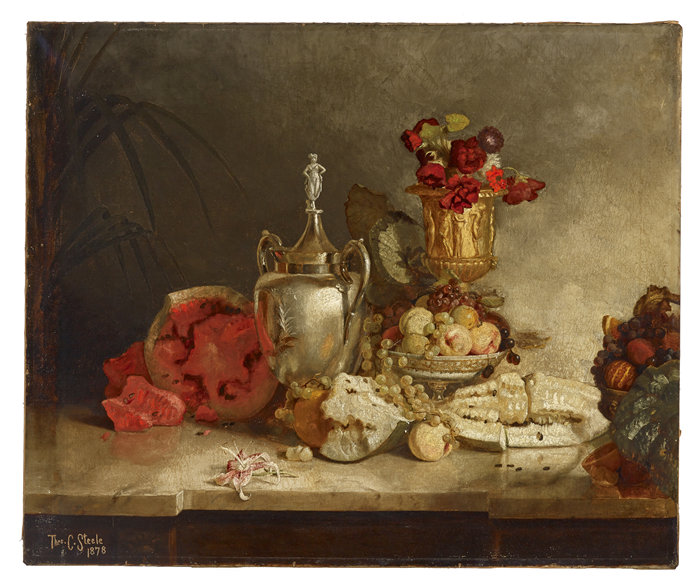 简介: 西奥多·克莱门特·斯蒂尔(Theodore Clement Steele,美国,1847-1926 年)-水果和瓮的静物