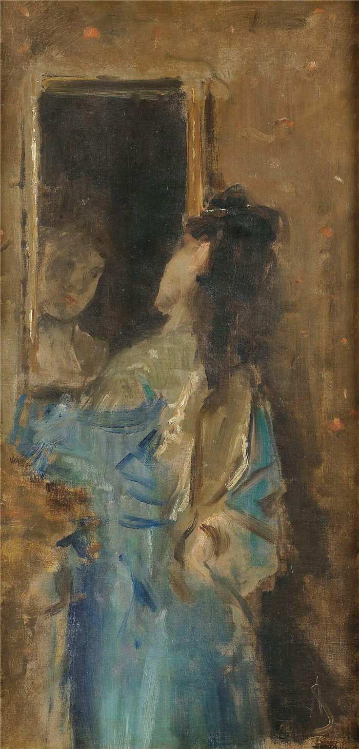 简介: 阿尔弗雷德·史蒂文斯(Alfred Stevens,比利时画家)作品-照镜子的蓝衣女孩
