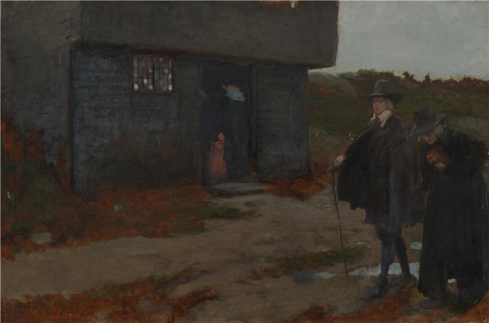 简介: 艾德文·奥斯汀·艾比(Edwin Austin Abbey,美国画家)作品-在小屋门口(17 世纪新英格兰场景)(约 1871-1911)