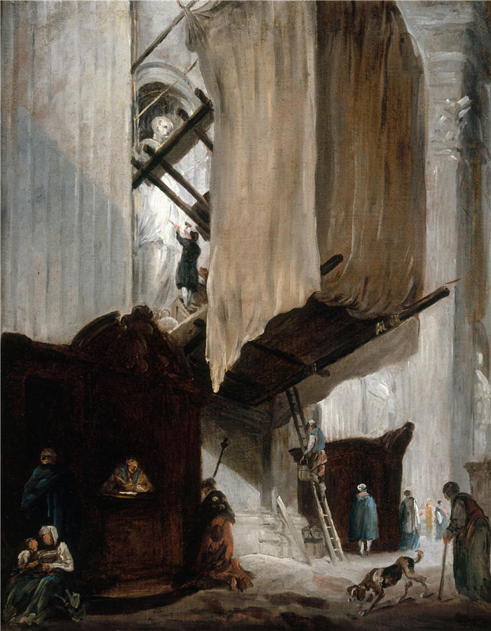 简介: 休伯特·罗伯特(Hubert Robert,法国画家)作品-雕刻家在罗马的圣彼得教堂 (1758-1759) 上制作圣人雕像高清下载