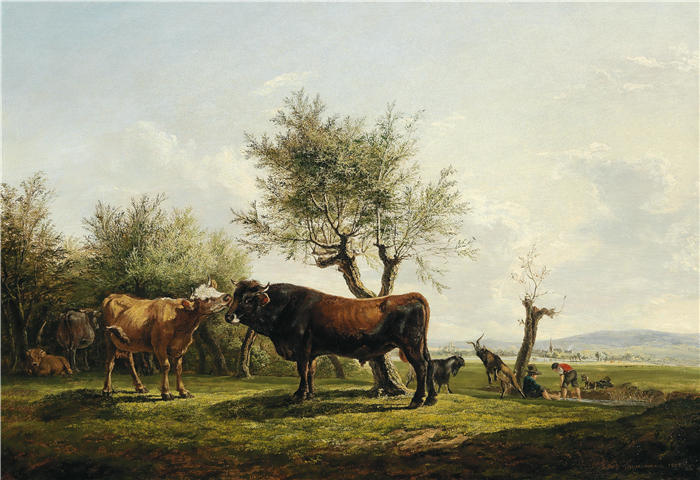 简介: 弗里德里希·高尔曼(Friedrich Gauermann,奥地利画家)高清作品-《一头牛在牧场上舔公牛(1824 年)》