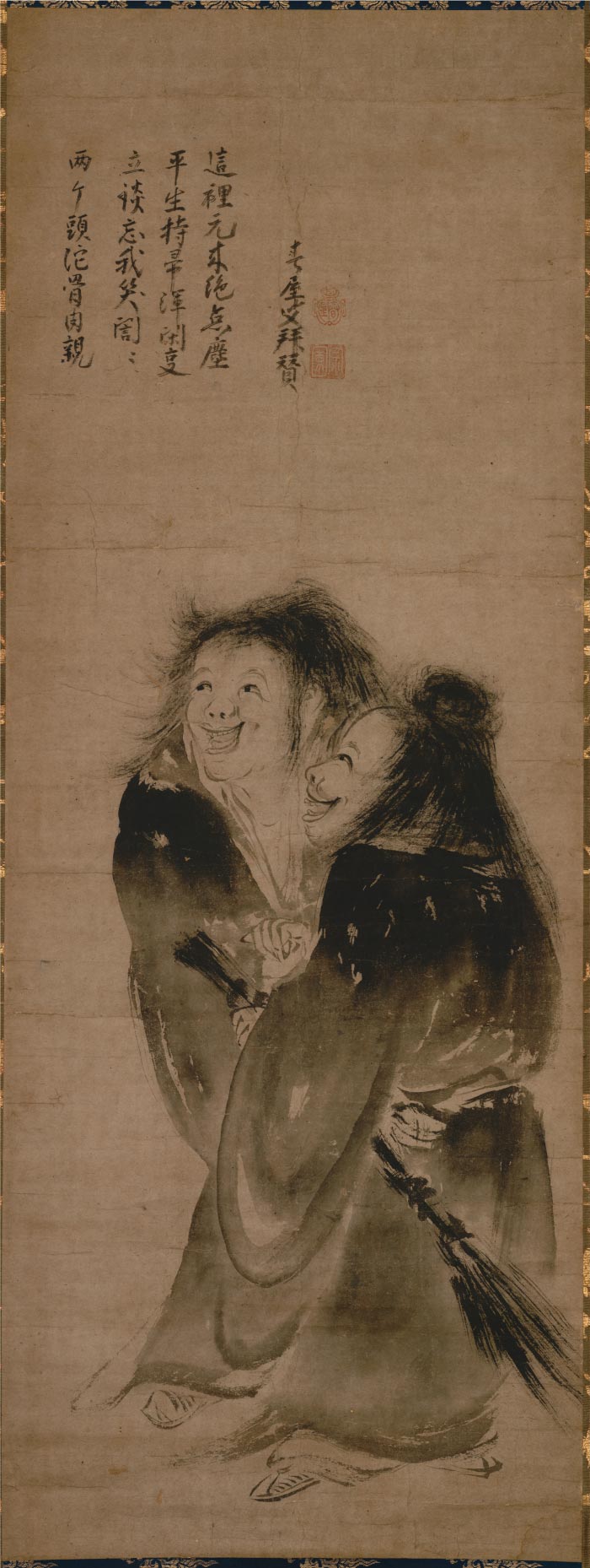 寒山与拾得为中国唐代高僧,举止多奇特,被誉为文殊、普贤两位菩萨的化身。二人飘逸(hyoitsu)之姿每每为中国及日本的禅宗寺院所属的画僧所绘。一般常见的是寒山握卷、拾得持帚之姿。本图却将二人绘于同一幅图中,大头小身为其特征。