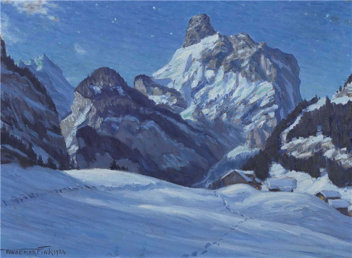 简介: 瓦尔德马· 芬克(Waldemar Fink)高清作品-坎德斯泰格附近的夜晚Mondnacht bei Kandersteg, 1924