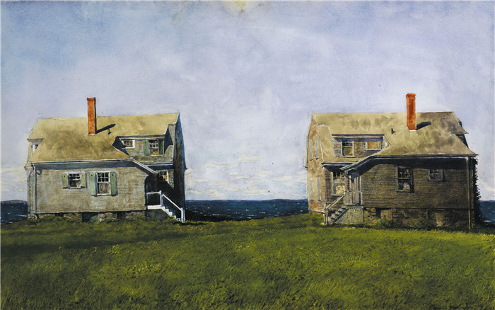 艺术家杰米·怀斯 (Jamie Wyeth) 于 1969 年创作的名为“双子屋”的艺术作品是属于当代现实主义艺术运动的风景作品。