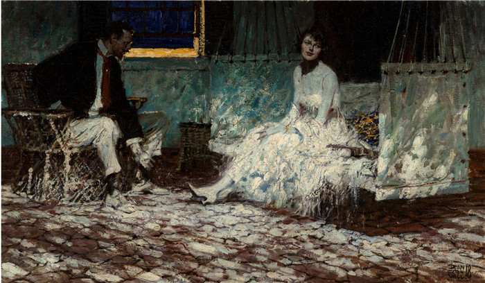 简介: 迪恩·康威尔(Dean Cornwell)作品-门廊扳手The Porch Wren, The Saturday Evening Post interior story illustration, July 20, 1918 Oil on Canvas