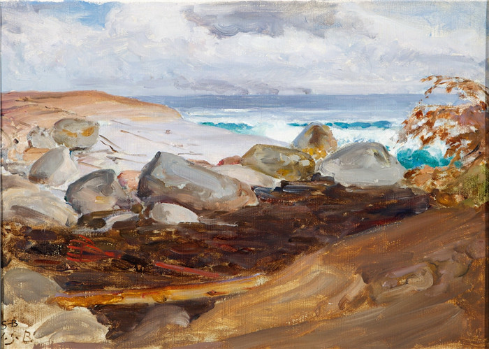 简介: 布罗费尔特(Venny Soldan-Brofeldt)作品-岩石海滩Rocky Beach, oil, sign., 40x55