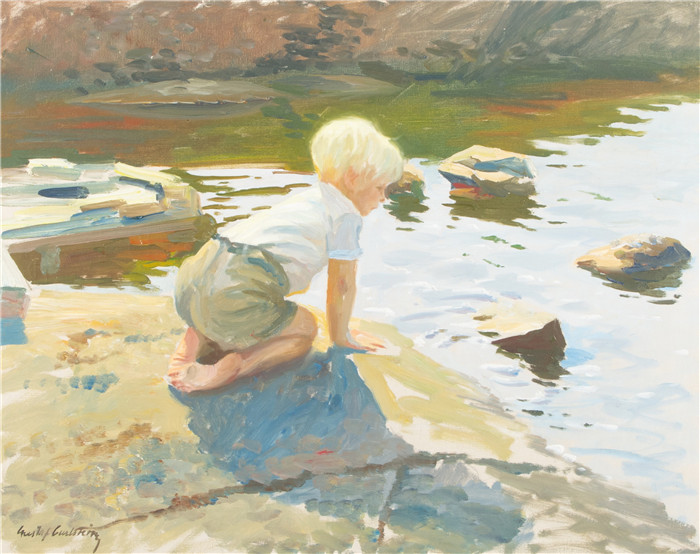 简介: 古斯塔夫·卡尔斯特罗姆(Gustaf Carlstrom)作品-海滨男孩 Pojke vid vattenbryn, olja pa duk, signerad
