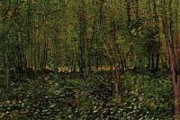 梵高以白色、黄色和红色的高光描绘了光线穿过树木落到低洼植物上的情景。光影的效果产生了许多绿色阴影,梵高在画布上用短笔触描绘了这些绿色阴影。一条黄色线暗示了一...