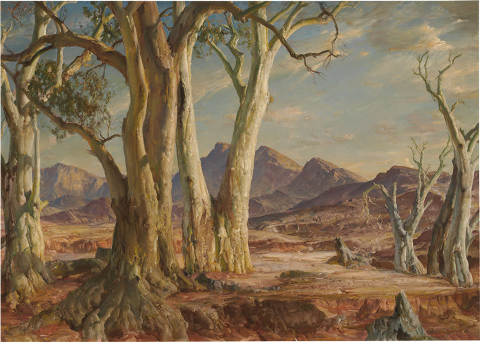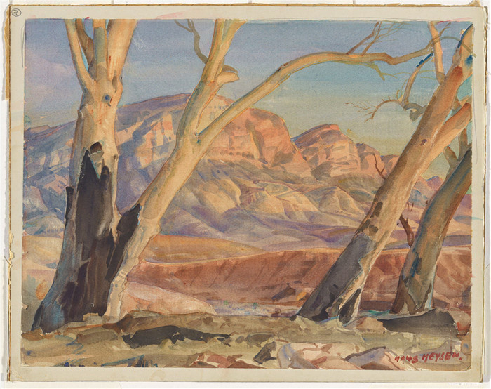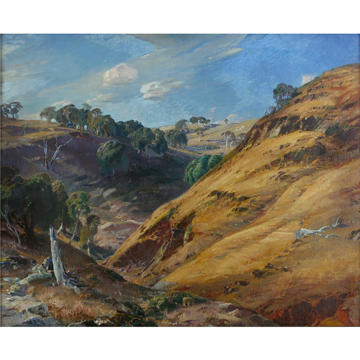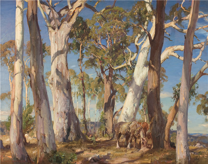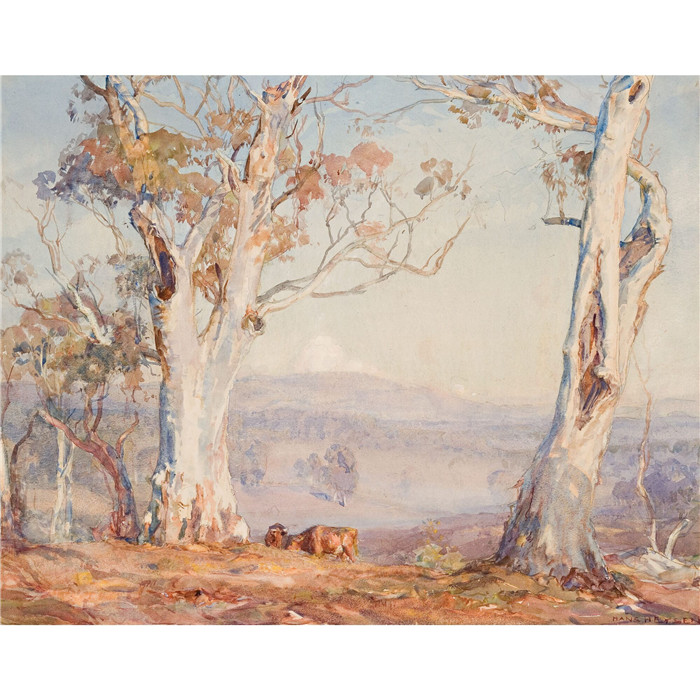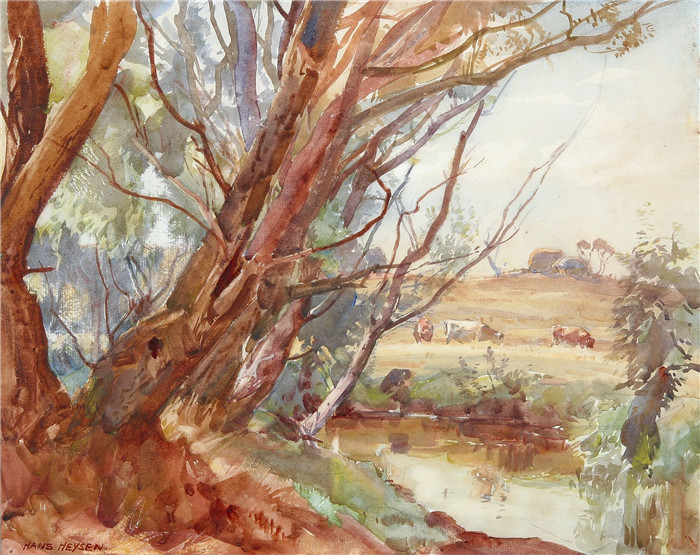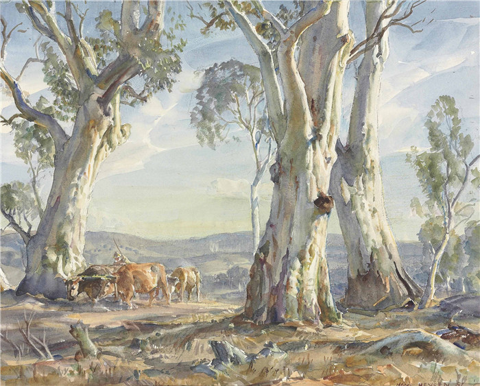 简介: 汉斯·海森(Hans Heysen)是另一位伟大的20世纪澳大利亚艺术家,海森出生于德国,7岁时随父母来到澳大利亚。他在澳大利亚学习,在欧洲学习了四年。他从事油料、木炭和版画家的工作,但以他的水彩画闻名。尽管他的主题包括静物、人物和许多种类的风景,海森主要是因他的明亮,处理精美的场景,结合了奇妙的橡胶树。你可以看到他对约翰·麦卡廷等当代澳大利亚画家的影响。 |