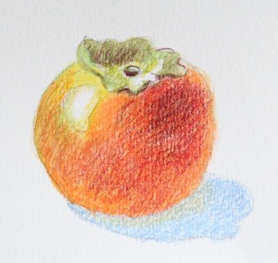 Then I took a wet brush to lift off some colors to the right lower area of the persimmon, indicating the reflected light. The advantage of using a water soluble colored pencil is that you can erase, to some extent, unlike wax-based and oil-based colored pencils.