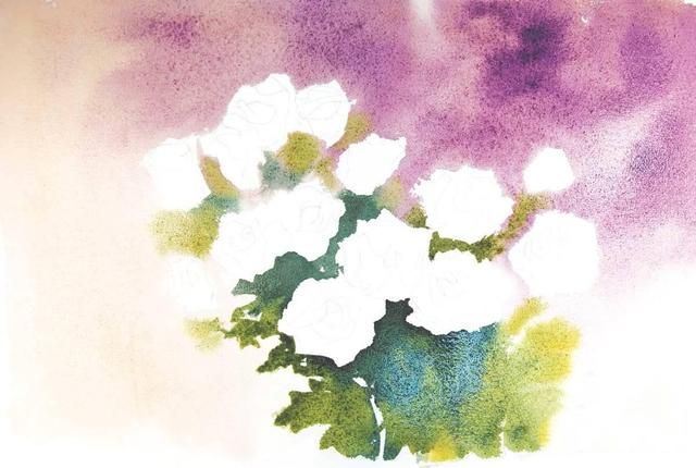接下来我们对白玫瑰的背景进行着色练习。首先只在草图的背景上刷水,此时应注意不要只集中在一处,而是要均匀地刷涂整个区域。