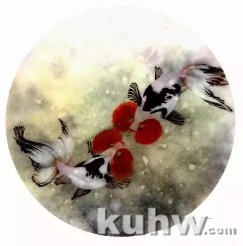 步骤二:钛白加少量藤黄,笔尖蘸一点玫红,略调,卧笔点出鱼脑,依次蘸朱砂、朱 色并调出层次,画出两尾金鱼的水泡和鱼唇。然后,调花青墨勾出鱼鳃和鱼眼。勾线切忌平均,要有粗细变化,以体现出鱼体结构的转折和笔墨的变化。要通过这些细节使扇面小品的信息量增大,内容丰富起来。