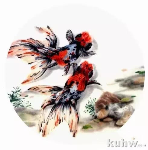 步骤三:调淡赭黄色侧锋由外向尾柄部扫出,笔锋含色要少要淡。按前面勾出的鳍尾主线,侧锋笔笔相接画出鱼鳍。以花青、重墨、橙红色勾点结合,画出鱼身体各部位的花斑、鱼鳞及深色鳍脉。尾柄向尾梢的部分用花青加少量墨色略微分染,用笔与前面相反,侧锋由尾柄向尾梢轻轻扫出,分染整个尾鳍的三分之一即可,这样一来,尾部的质感就更加明显了。淡花青色勾金鱼身下阴影,用笔不可死板,用色不能过重。