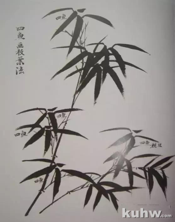 “四鱼”的组叶形式适合表现晴竹,一组叶中有正面叶子、侧面叶子,形态舒展,使画面有较强的空间感,同时能准确地表现出竹子生机盎然的状态。