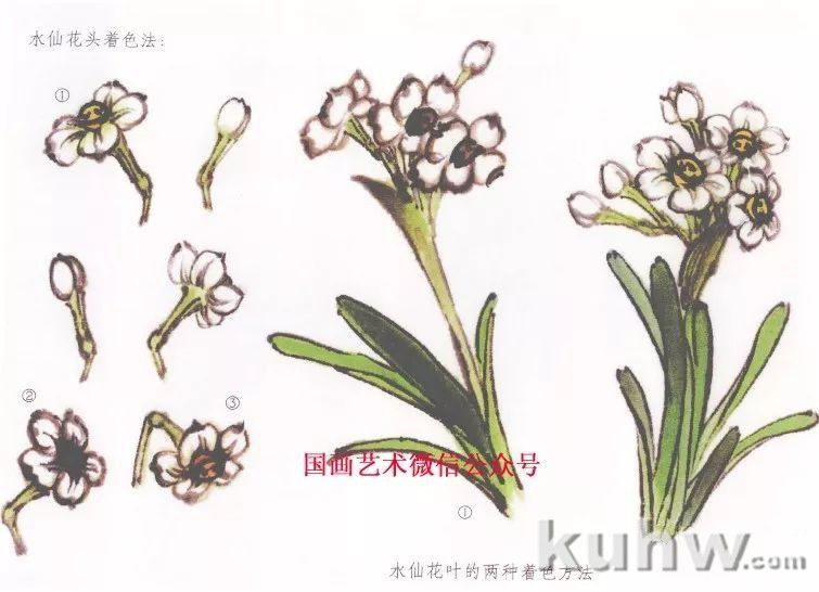a.先将藤黄加三绿调成嫩汁绿色,即很淡的黄绿色,再加入少许赭石相调合,使黄绿色略带暖色。然后即可用大白云笔蘸色逐瓣涂于水仙花瓣的背光处和凹陷处,以及近杯状副冠的花瓣根部,用笔应从根部(内)向瓣尖(外)涂。注意:水仙花瓣的瓣尖处,约占整个花瓣的三分之一或者是五分之三的部分,均需要留出空白。趁湿时,我们可以再将大白云笔洗净后蘸白色与少许清水调合后,自瓣尖向瓣根部涂,使原先已涂上的暖汁绿色与白色自然融合,形成瓣尖白、瓣中部略带绿、根部较绿的效果,使花瓣具有较强的立体感。接下去我们就可用藤黄加少许曙红调成黄橙色,涂于杯状副冠上,其侧面可略深一些,中间花蕊部可略淡一点。最后再用藤黄加花青调成汁绿色,平涂于管状物和花柄上。待完全干透后,还要用狼毫笔蘸较浓墨在花瓣尖部进行勾线,称之为“复勾”。复勾时要自然、生动,不必过于拘泥于原有的墨线,可以稍微离开一些勾,这样效果更好。