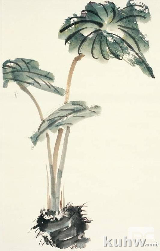芋艿多生长在江南水岸,俗称“芋头”,有头有叶,色彩青翠,枝叶高丈许,芋头美味香切。画芋艿可用大笔调藤黄加花青,再加墨,先画叶再画枝干。