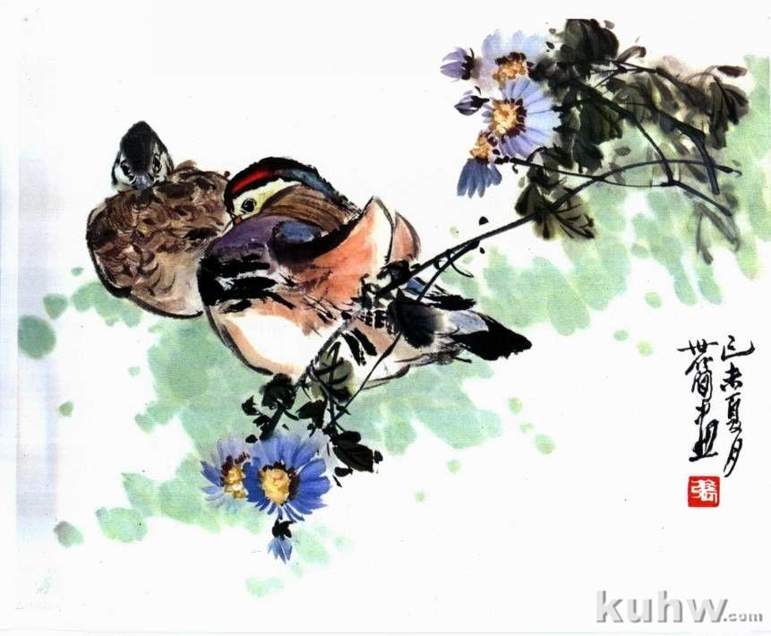 国画色有透明也不透明两大类,石色属于不透明色,如朱砂、赭石、石青、石绿、石黄、白粉等,其特点是覆盖力强,常在浓墨上加石色更显鲜艳。此鸳鸯之冠羽和背尾部均加石色,如画翠鸟、孔雀、点花心等均可用此法,但要避免用得死板。