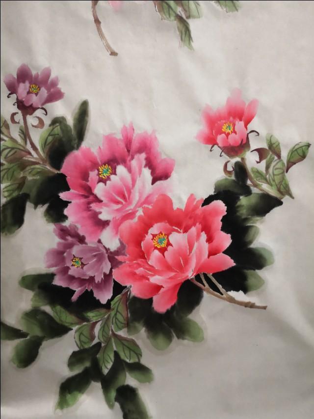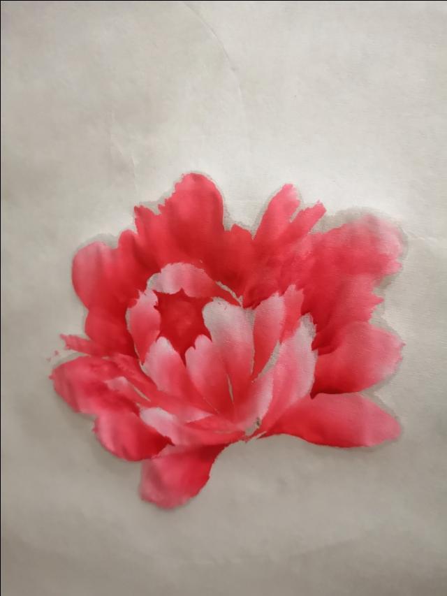 钛白加水调好,笔蘸白色,笔尖蘸大红(少许),先画出牡丹的内部。