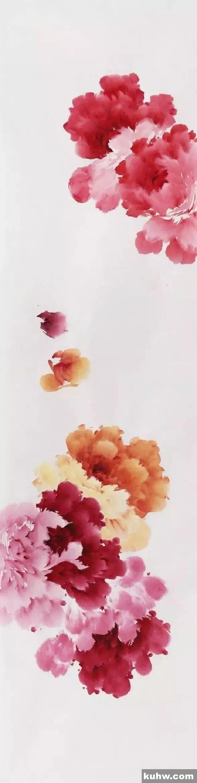 第一步:牡丹花头的绘制采用三号羊毫斗笔,中锋笔法绘制。上方粉红花头笔肚蘸上少许钛白,笔尖调入淡大红,用点厾笔法刻画反面花瓣,随后,毛笔前方加入稍浓的大红,调匀后笔尖蘸浓曙红继续用点厾笔法刻画正瓣,最外层花瓣用色要深一些。靠近花房的最暗部,笔尖加入少许墨红深入刻画。下方的浅红花头绘制笔法同上方,反瓣颜色以钛白调曙红为之,正瓣颜色笔肚曙红,笔尖蘸胭脂点厾笔法绘制,最暗处笔尖调和中墨点写。黄色花头:反瓣笔肚钛白,笔尖藤黄。正瓣在反瓣原有的基础上,笔尖多加曙红调和。