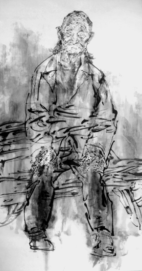 第三步,深入刻画(见图)。在前两步中,表现人物结构的线条为我们这一步的深入刻画奠定了基础。为使画面润泽、厚实,我们可用饱含水分的大笔蘸淡墨进行大面积的皴染,并按照人物结构趁湿反复皴擦,尤其要详细刻画人物的细微之处。皴擦人物结构时,我们要在最初结构线的基础上进行深入刻画。可以待第一遍墨干后再上第二遍墨,待第二遍墨干后再上第三遍墨,以此类推;也可以趁湿反复地渲染人物。有的部位要精心而深入地刻画,如眉骨、五官、颧骨、脸部的皱纹、嘴缝、下颚等;有的部位可以用墨大面积地渲染,如头发、衣服,但也要表现出它们的体积感。对人物进行深入刻画时,要注意黑、白、灰的关系,要与周围景物的笔墨协调。总之,我们要大胆落笔、细心收拾,笔墨要鲜活、生动,不能把人物画僵、画死。 (13)