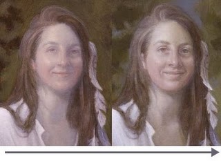 Into the wet surface, I add color. See my demo on Old Master Color Banding in Portraiture for particulars.