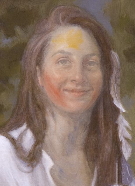 ABOVE: Here is a peek at the next layer (uncorrected as to likeness, without a skin tone glaze and ill-defined features). The light is now so thick you cannot see the weave of the canvas through it. I’ve started to work on the hair. I wish this photo wasn’t so small – it is really quite a jump forward.