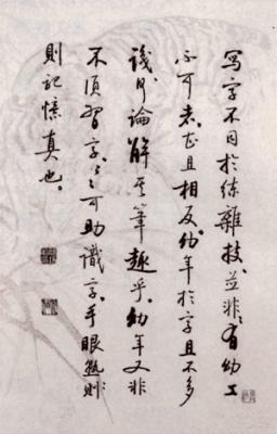 书写落笔之前,先执笔在空中画个圈,使所要写的字不超出这个圈,就说明你这时执笔的高低、提腕还是悬肘等等是符合要求的,自然的。如写小楷,即使腕贴在纸上,小圈圈也能画得出来;如写大字,就要画个合适的大圈,腕与肘不悬起来是画不成的。所以写字时,执笔的高低、腕是否该提、肘是否该悬、提悬到什么程度,并无固定标准,应该随当时所写字的大小需要而定。