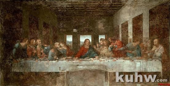 《最后的晚餐》是画在修道院墙上的壁画,表现圣经故事中的经典场面:耶稣坐在中间,说出"你们之中有人出卖了我"这句话,身边的门徒们表现出各种不同的反应。