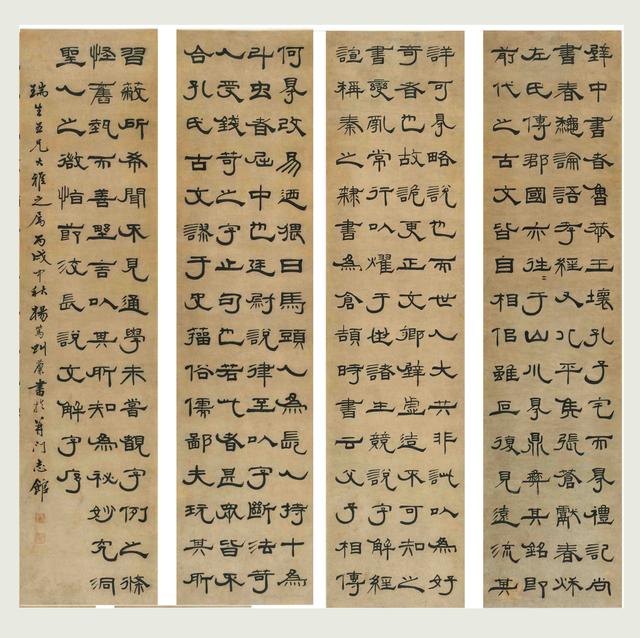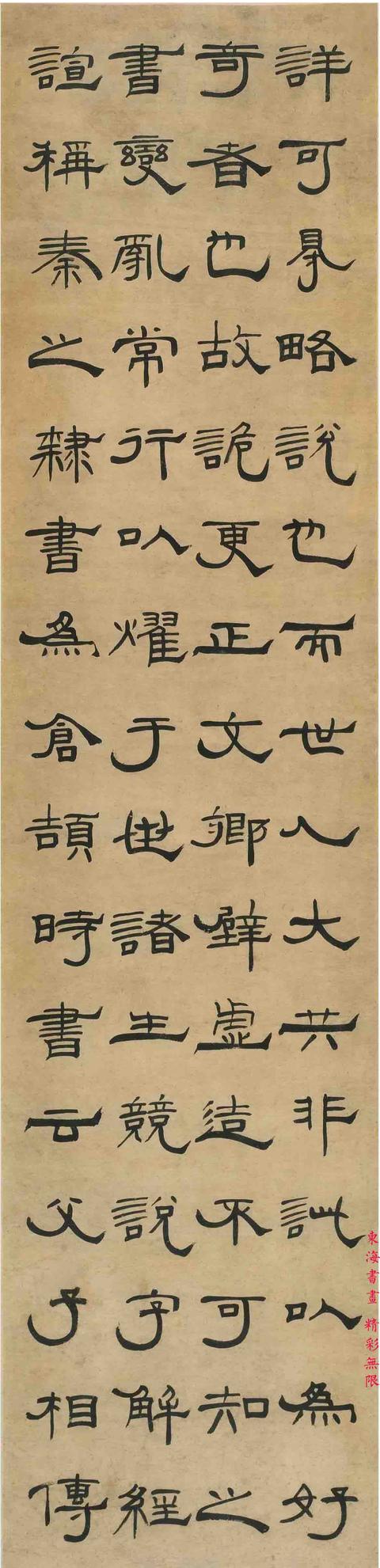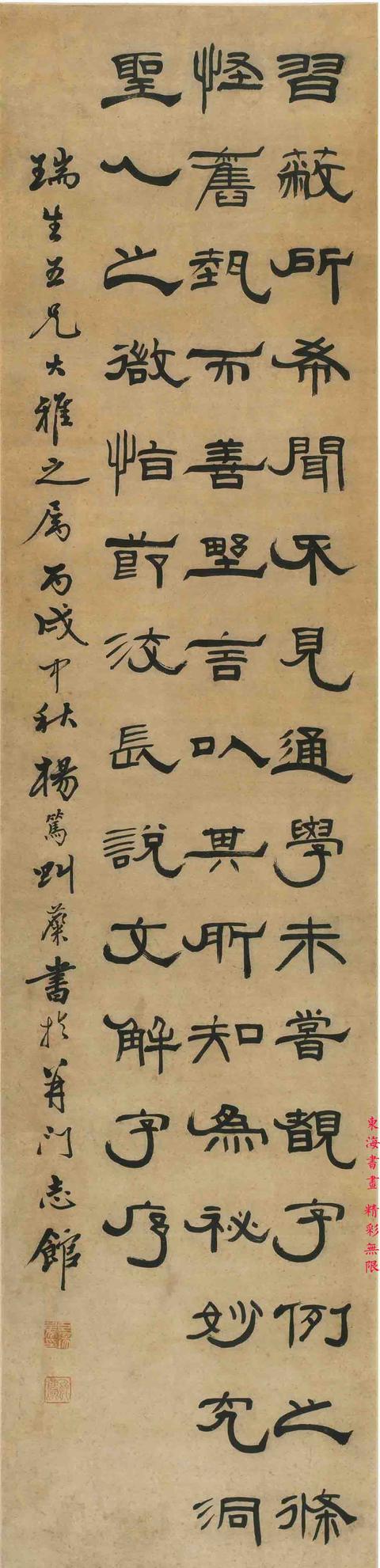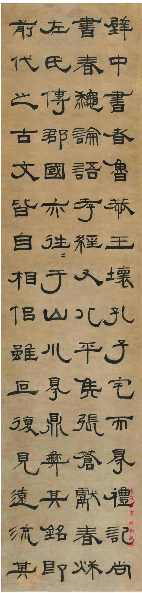 释文:壁中书者,鲁恭王坏孔子宅,而得《礼记》、《尚书》、《春秋》、《论语》、《孝经》。又北平侯张苍献《春秋左氏传》。郡国亦往往于山川得鼎彝,其铭即前代之古文,皆自相似。虽叵复见远流,其详可得略说也。 而世人大共非訾,以为好奇者也,故诡更正文,乡壁虚造不可知之书,变乱常行,以耀于世。诸生竞逐说字,解经谊,称秦之隶书为仓颉时书,云:“父子相传,何得改易!”乃猥曰:“马头人为长,人持十为斗,虫者,屈中也。”廷尉说律至以字断法:“苛人受钱,苛之字止句也。”若此者甚众,皆不合孔氏古文,谬于史籀。鄙夫俗儒,翫其所习,蔽所希闻。不见通学,未尝睹字例之条。怪旧执而善野言,以其所知为秘妙,究洞圣人之微旨。 节汉说文解字序 瑞生五兄大雅之属 丙芮中秋杨笃虬麋书于并门志馆