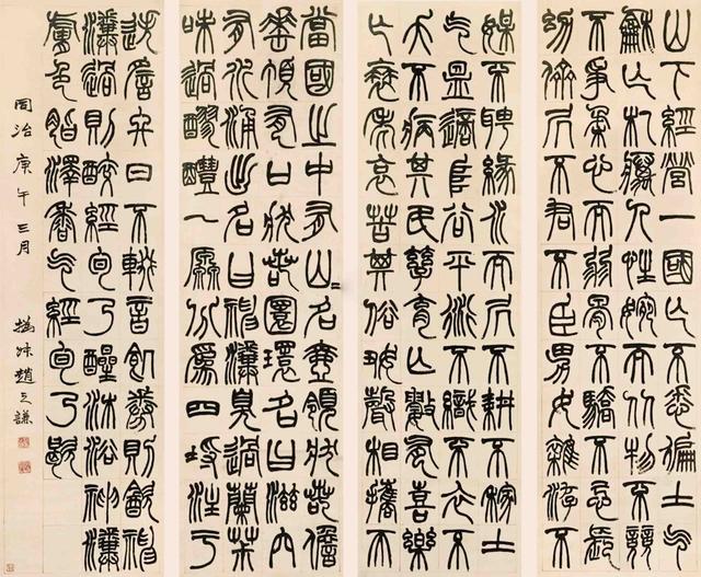 赵之谦1870年篆书节录《列子》四屏 作者:admin 时间:02-06 浏览: 错误报告 题识:同治庚午三月撝叔赵之谦(庚午1870年)钤印:赵之谦印、赵之谦同治纪元以后作 延伸阅读: 钱泳(清)临汉《出州刺史朱龟碑》等 四屏尉天池隶书节录张怀瓘《书论》孙晓云 2006年 行书四屏李宗瀚(清)行书古诗文四屏赵之谦 篆书节录“陋室铭”立轴于右任行书古语 四屏立轴陈少默1984年节临《张迁碑四屏》李逢治(清) 楷书节录 韩愈《原道》四屏龚望1987年作 书法 四屏立轴莫友芝 1867年作 篆书节录诗经 镜心 标签:赵之谦 篆书 节录 四屏 上一篇:赵之琛(清)1850年 隶书七言诗 下一篇:陆润庠癸卯(1903年)行书七言诗 镜心 最新文章推荐 约翰·克里斯蒂安·达尔(Johan Chri 朱利安·杜佩(Julien Dupré)作品-Ha 弗雷德里克·埃德温·丘奇(Frederic 神坂雪佳(Kamisaka Sekka,日本画家) 路易斯-让-弗朗索瓦·拉格尼(Louis- 弗朗索瓦·布歇(François Boucher) 留言与评论(共有 条评论) 验证码: