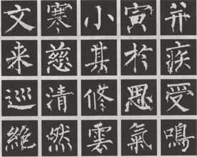 1.点。古人认为,点是字之眉目。《神策军碑》的点,可谓方圆有别、正仅怀同、顾盼生姿、映带自然。无论是点与点的组合,还是点与其他笔画的组合,都表现得异常生动。如右图中“文”字的首点取侧势,笔势趋向横的起笔,呈圆势;“寒”字的首点呈方头启下势,左竖点垂露欲滴;“小”、“寅”、“并”、“来”、“慈”、“其”六字的横两点,在正侧、方圆、映带等方面均有不同的变化;“于”、“疾”、“巡”三字的纵两点则顾盼、映带自如;“清”;“修”、“思”、“受”、“绝”五字的三点,或方圆,或开合,或映带开启;四点者,如“然”、“云”、“气”、“鸣”四字,在点的取势上尤为突出,既聚散得体,同时又各具神态。