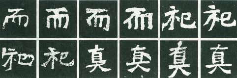 7、“真”字。如附图中第一个“真”字结字较为缜密,整个字形欹侧取势,向右倾斜,通过捺画来调整字形重心,起到复归平正的作用。第二个“真”字形体较为宽博,字形中间横画缺少一笔,临摹时可照样临,创作则不宜,字形下方两点,近似对称,如一叶小舟上鼓荡起的双桨,跳跃性极强。第三个“真”字形体较大,字形同样也欹侧取势。临摹时要注意,下方横画起笔可以再自然些,切忌描摹而成墨团。第四个“真”字较为清秀,平中见奇,临摹时要把握笔画轻重。