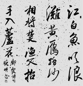 可以说,严晓明把自己一生中最宝贵的时光都奉献给了书法事业。她就像生长在书法之树上的一片绿叶,为了繁花似锦、浓荫匝地,默默地付出着自己的一份努力。如今她又开始参与策划将于2009年举行的第三届北京国际书法双年展。我衷心祝愿她的事业蒸蒸日上,艺术常进常新!(二图均为严晓明的书法作品)