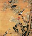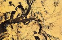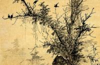 秋林聚禽图 明 林良 此图是林良写意花鸟画中的佳作。以乌桕树和雀鸟为题材,构图周密,笔法纵横豪肆,墨色苍劲淋漓,画面中对繁简、浓淡、虚实、疏密的处理都有独到之处,表现...