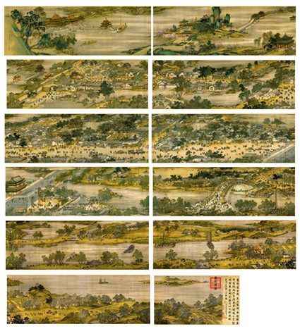 《清明上河图》以精致的工笔记录了北宋末叶、徽宗时代首都汴京(今河南开封)郊区和城内汴河两岸的建筑和民生。该图描绘了清明时节,北宋京城汴梁以及汴河两岸的繁华景象和自然风光。作品以长卷形式,采用散点透视的构图法,将繁杂的景物纳入统一而富于变化的画面中,画中人物1000多,衣着不同,神情各异,其间穿插各种活动,注重戏剧性,构图疏密有致,注重节奏感和韵律的变化,笔墨章法都很巧妙。全图分为三个段落。