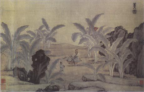 明代画家杜琼的《南村别墅图册》为纸本,设色,纵51.2厘米,横33.3厘米,现藏上海博物馆。我们现欣赏的《蕉园》(见上图)是《南村别墅图册》中的一帧。展开《蕉园》,干净透明、精巧灵动的画面,有如一首小令,让观者神清气爽;又如一瓶清凉剂,荡涤观者心中的浮躁。小园内,几块嶙峋的山石,数株摇曳的芭蕉,一位扎着发髻、留着胡须,手执拂尘的文人斜坐在地上,似乎在追忆着什么,旁有一书童侍立。画面看似简单,只不过是描绘了古代文人的一个生活片段而已;然而,细究之下,却发现此画于简单中又有不简单之处。