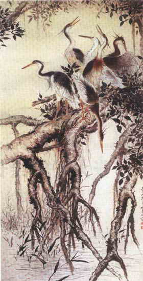 整个构图高低避让,张驰有致,显示作者驾驭巨幅画面的深厚功力。画中六只鹭聚居在浅滩树丛中,或引吭高歌,或低首觅食,顾盼欲语,极富人情味。盘根错节的树根占据了画面大部,水草丛生、树藤缠绕,线条潇洒俊逸,刚劲而富有韵律变化。墨彩交融生辉,又不失传统国画的韵味。观之让人仿佛置身在大自然的野趣中而忘记尘世间的烦扰。 与传统文人意趣的花鸟画有所不同,方人定特别重视所画对象造型的真实性,这反映出其严谨的科学的创作观。此画在鹭群形象的刻画上体现的尤其突出。从动物学常识中我们了解到,画中所画的鹭种是南亚地区常见的草鹭:它的特征为顶冠黑色并具两道饰羽,颈棕色且颈侧具黑色纵纹。背及覆羽灰色,飞羽黑,其余体羽红褐色。草鹭多栖息在沼泽、田边、水塘等芦苇或杂草丛生处,常常3―5只在一起活动。它们喜欢把巢穴建在枝叶浓密的松、榆等树上或者偏僻的苇塘边,所以它们经常在树上休息。它们长久站立,伸颈张望好似木桩一样,当食物在近处时,就引颈啄捕,当食物在远处时,则急步向前捕食。方人定将这些特点都表现得细致入微,自然生动。可以说,他在花鸟画创作上所表现的这种严谨的理性精神恐怕只有宋人能和其比肩。