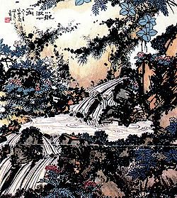 针对1950年代初,某些“民族虚无主义”者抨击中国画不能作大画,不能上墙,只宜于案头展玩的观点,潘天寿以“至大、至刚、至中、至正之气”,致力于“登峰造极”的艺术境界的开辟。他改变了传统文人画“逸笔草草”,随机生发的创作方法,以“意笔工写”的态度,刻意经营作品的结构章法。论他的笔墨,是雄强奔放,不受羁绊的,犹如一匹烈性的野马,横冲直撞,“天惊地怪”;而论他的布局章法,又是严重周密,惨淡森严的。从四角四边的关系,方形、三角形、不等边三角形的解析,天平、老秤的比喻,题款、钤印与画面形象的搭配,其严谨性几可与数理科学相媲美。这就好比给一匹野马套上了缰勒,目的并不是为了扼杀野马的烈性,而是为了使野马的烈性得以理性的控驭。严谨的章法与雄悍的笔墨相为制驭,使潘天寿的作品郁勃着一股巨大的生命张力,严谨而不僵板,雄悍而不粗野,大气魄,大力量,大境界,如关西大汉执铁板铜琶唱“大江东去”!“登峰造极”的壮美、崇高,给人以惊心动魄之感,这是真正力作型的大创作,而无论它的幅面是大还是小。 上图为小龙湫下一角图轴,(国画)潘天寿。