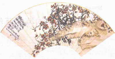 清代恽寿平云:“画扇不同于画册页,扇面圆曲,影亦随之圆曲,此应其变也,”折扇扇形的特殊性决定了扇面构图随形的要求,也决定了扇面空间意识的特殊性。清末“海派”大家吴昌硕的这幅《梅花图》(见图),画面构图跌宕奇险,两块湖石自右侧横亘画中,淡墨几笔出之,稳重而又不失灵透,显示出画家驾轻就熟、胸有成竹的艺术造诣。湖石之后探出红梅数枝,花如碎玉横