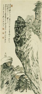 此图采取高远法,近取其质,远取其势,不落寻常蹊径。笔力挺拔刚劲,浑厚沉着。墨气明润,枯湿相间,虚实相生,细致而又秀润雄浑,繁而不乱。此幅是张大千敦煌之行时所作,可说是张大千画风转变之开始,故在张大千山水画风格形成的研究中具重要意义。