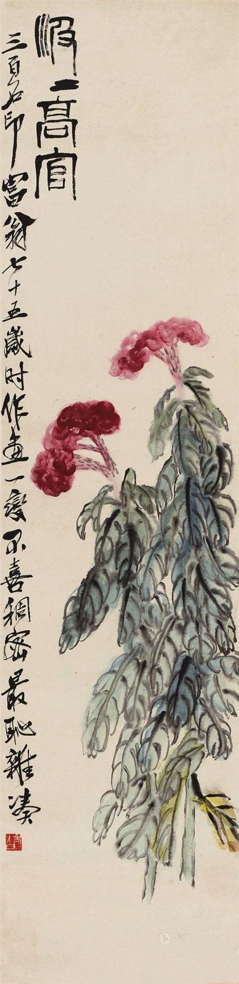 齐白石《汲汲高官》:此图中,白石老人将鸡冠花描绘得美轮美奂,硕大的花朵以鲜艳的胭脂数笔绘画,不但浓艳,更表现了花朵的肥厚感和细毛的质感;花叶用淡绿敷染,再以浓淡不等的墨线勾勒,叶片层层叠叠,铺满茎杆。整幅章法甚为简率,却在花卉的绰约风姿,红与绿的巧妙搭配,以及叶片的穿插中显得丰富而有变化,生动有致,匠心独具,颇富田野清趣。此外,本幅还有一层寓意,画中鸡冠花呈上下分布,形成冠上加冠之意,画幅左上侧的篆书题跋“级级高官”点明主题,寓意官运亨通。