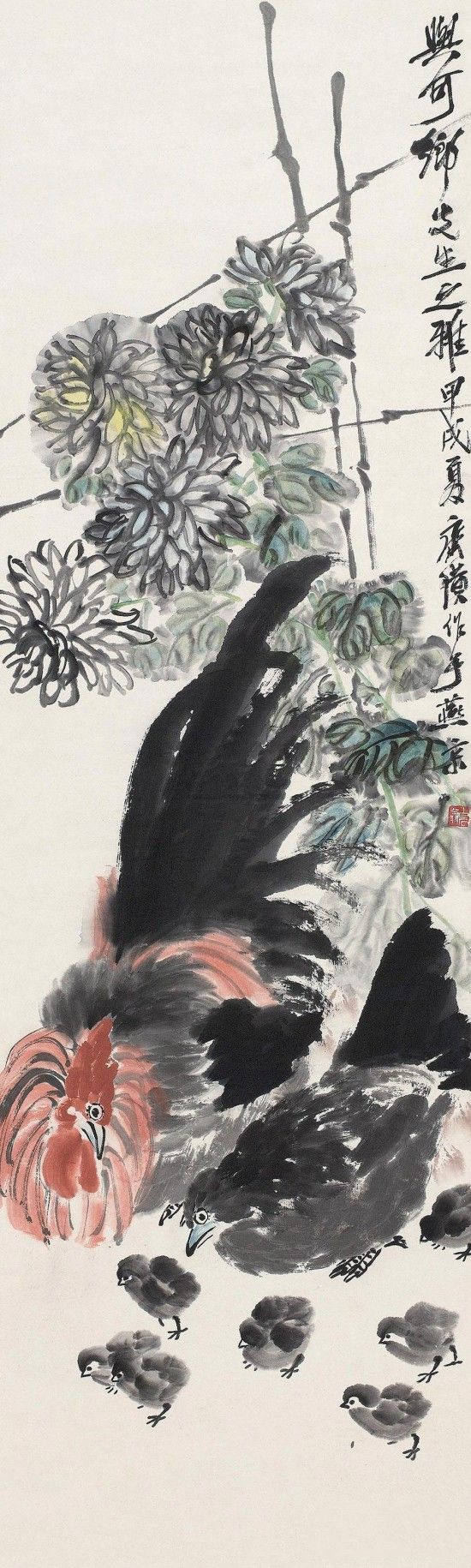 齐白石《护雏图》作品介绍:纸本,立轴,设色;纵138.5厘米,横41.5厘米;作于1934年;藏于不详;识:舆可乡先生之雅。甲戌夏,齐璜作于燕京。印鉴:白石翁。