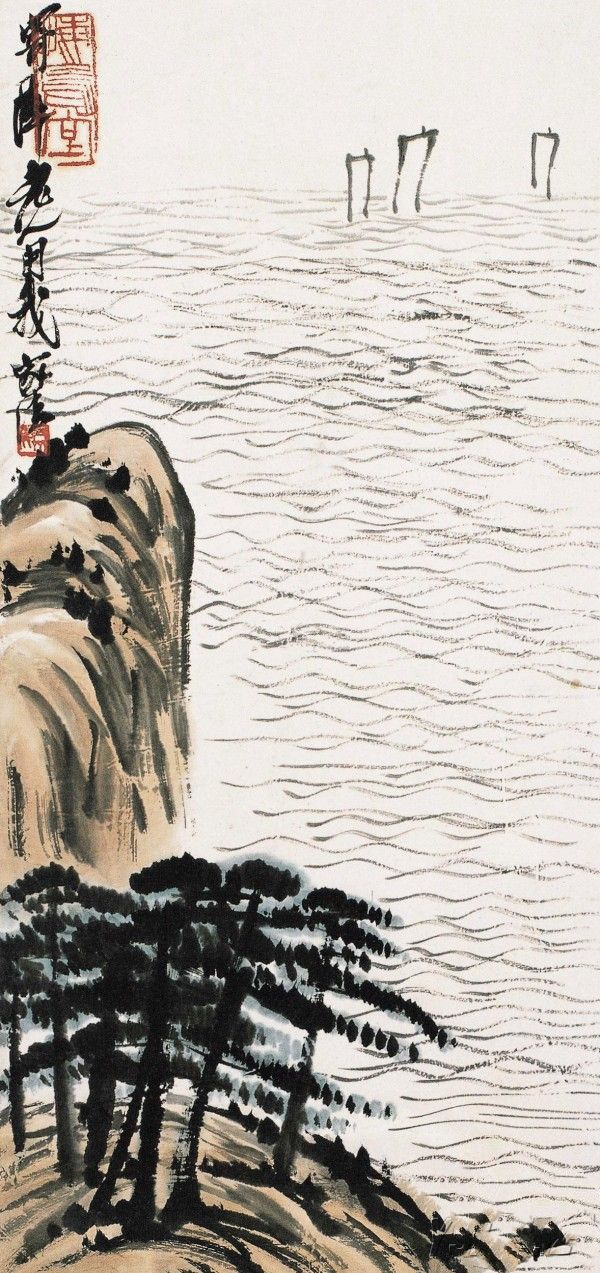齐白石《沧海归帆图》作品介绍:纸本,立轴,设色;纵67.5厘米,横37.5厘米;藏于不详;款识:寄萍老人用我家法。钤印:悔乌堂(朱) 老齐郎(朱)。