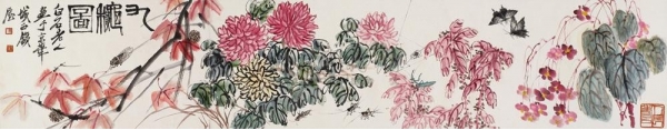 齐白石《九秋图》:此作以写意法画菊花,海棠,秋栗,红叶,在写意的花叶里头蟋蟀、螳螂、蜘蛛,蝴蝶好不热闹!画作造型简练、神态活泼、构思新颖、色彩丰富,融中国传统写意画与民间绘画的表现技法于一体,花卉、草虫,极为精致美妙,便可窥其屦迹。再者,画家注意观照自然,专心致志理解、描摹所画之物的动态、神情。他从实际生活的真切感受下笔,故能“得心应手”而“兼备形神”。用笔浓重、老辣,善用枯笔与焦墨;用色注重明快,喜用原色,对比感强。