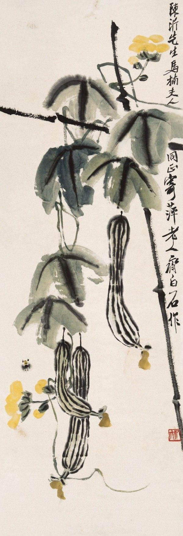 齐白石《丝瓜蜜蜂》作品介绍:纸本,立轴,设色;纵102厘米,横34厘米;作于不详;藏于不详。