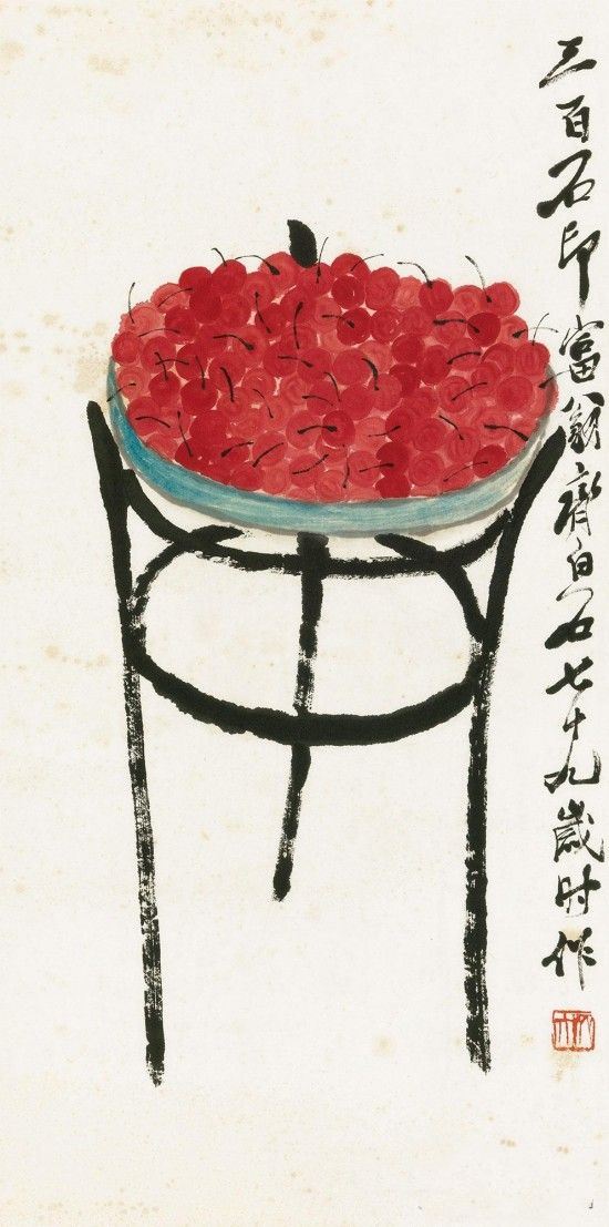 齐白石《樱桃》作品介绍:纸本,镜心,设色;纵69厘米,横34厘米;作于1939年;藏于不详;款识:三百石印富翁齐白石七十九岁时作。钤印:齐大。