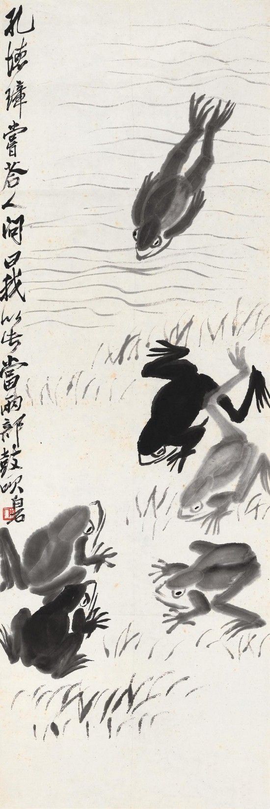 齐白石《蛙趣图》:此作以水墨涂染六只青蛙群集聚会,两只早已等在当地,一只刚跳下地,四肢刚着地,身体还没放松;两只刚爬到,其中一只一条腿还没来得及收回;一只正从水中游过来,六只各各神态动作不同,极为生动活泼,令人不禁莞尔。又以淡水墨略略勾画水线和草,整幅意趣盎然,栩栩如生。